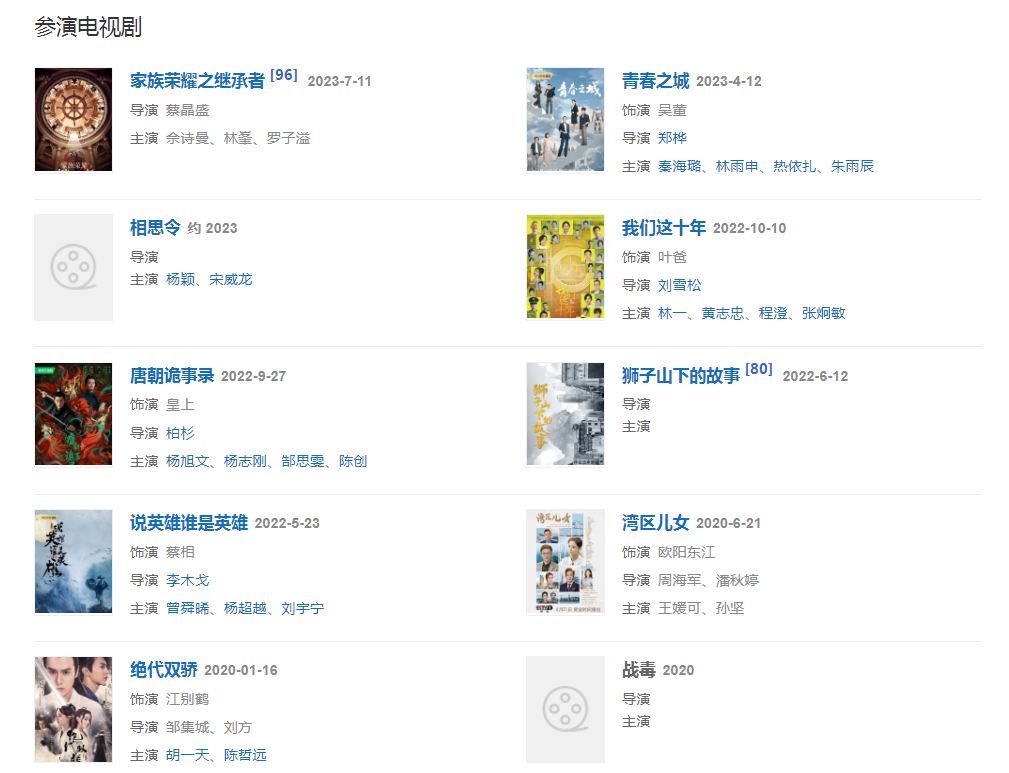 代表作品:天地男兒、難兄難弟、天地豪情、創(chuàng)世紀(jì)、流金歲月、昭君出塞、鄭和下西洋、富貴門、精忠岳飛